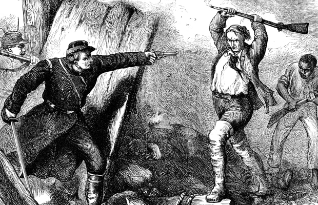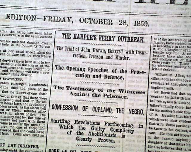 In the summer of 1859, with an armed group of 16 white and 5 Black abolitionists, Brown set up a headquarters in a rented farmhouse in Maryland, across the Potomac from Harpers Ferry, the site of a federal armoury. On the night of October 16, he quickly took the armoury and rounded up some 60 leading men of the area as hostages. Brown took this desperate action in the hope that escaped slaves would join his rebellion, forming an “army of emancipation” with which to liberate their fellow slaves. Throughout the next day and night, he and his men held out against the local militia, but on the following morning he surrendered to a contingency of troops under the command of Col. Robert E. Lee, including a small force of U.S. Marines that had broken into the armoury and overpowered Brown and his comrades.
